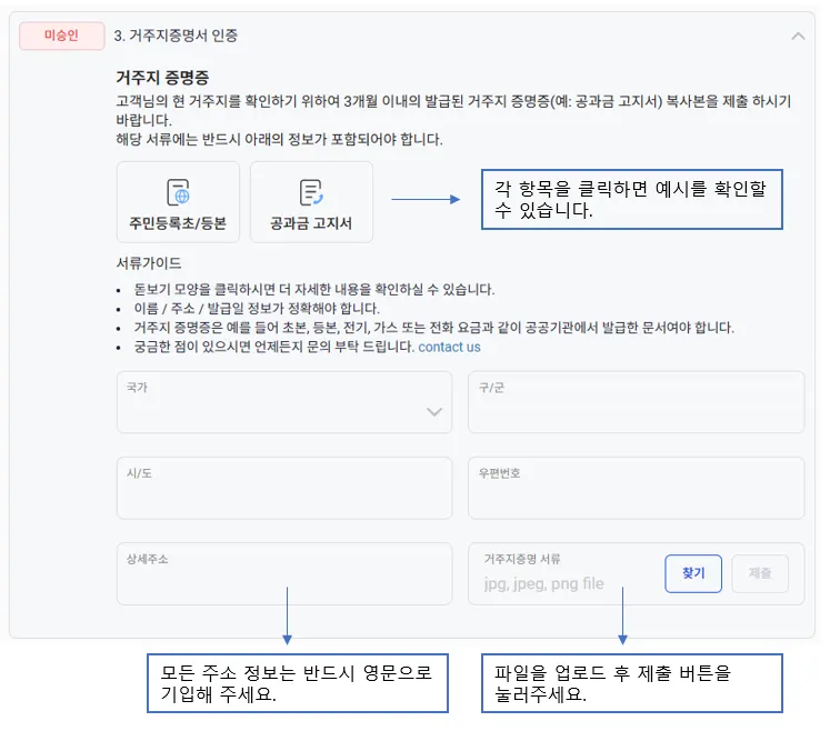 거주지 증명 서류를 제출하시면 담당 부서에서 유효 여부 및 정보 확인 후 승인을 진행합니다.