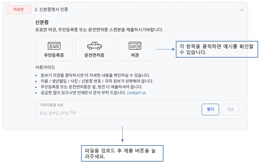 총 3개의 인증 단계가 있으며 모바일, 신분증, 거주지 증명서 인증을 진행해야 합니다.