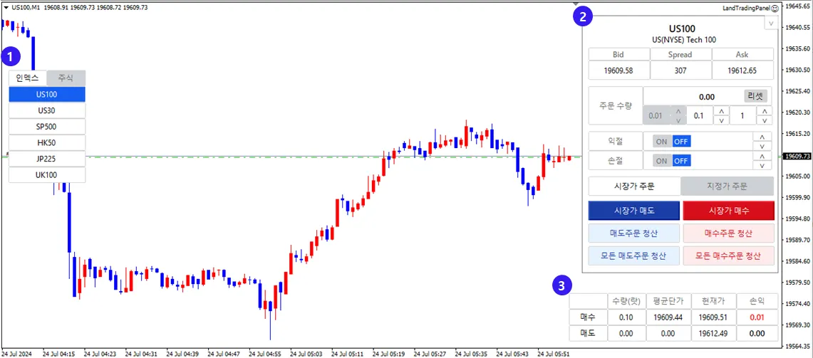 현재 열려있는 종목의 가격, 평균가격 및 손익을 보여주는 영역입니다.