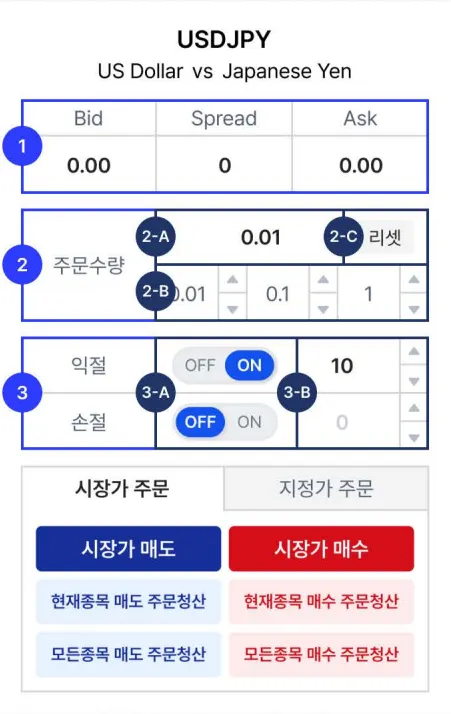 주문 수량 조절, 익절/손절 설정, 시장가 주문 및 지정가 주문 기능 등 주문 시 사용하는 가장 중요한 영역입니다.