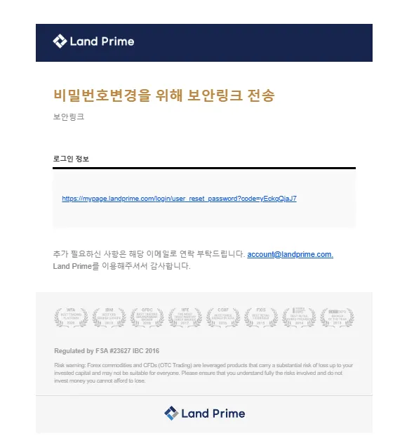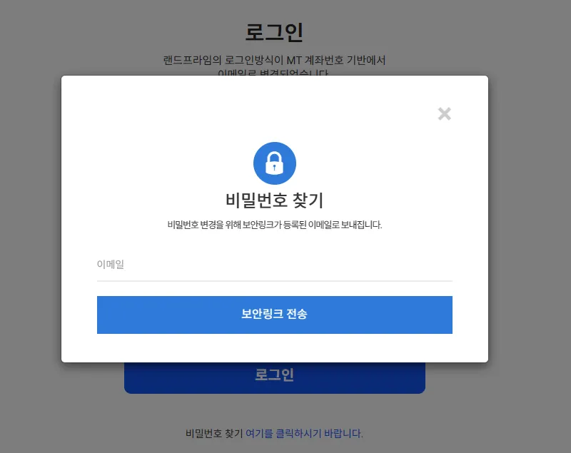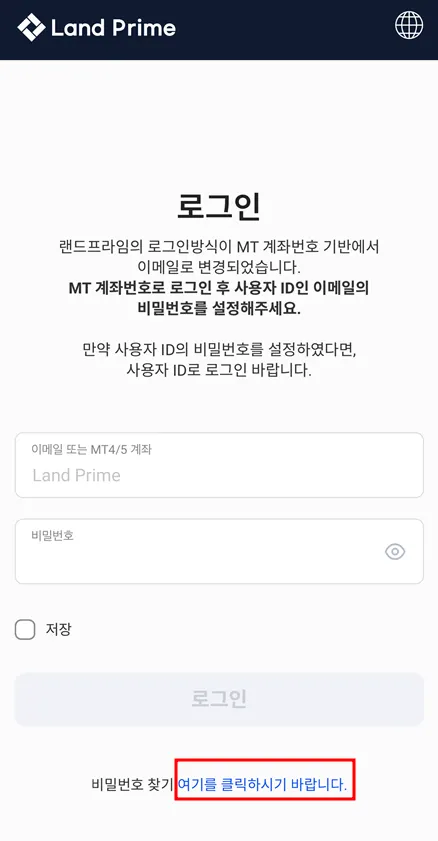 https://mypage.landprime.com/login에 접속하여 로그인 하단 부에 파란색 글씨인 ‘여기를 클릭하시기 바랍니다.’를 눌러주시면 됩니다.