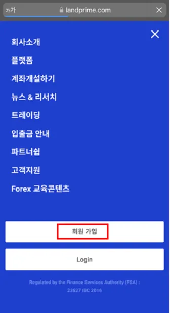 1. 모바일을 통해 Landprime 홈페이지 접속 좌측 상단 메뉴바 버튼을 누르시거나, 배너에 표시된 계좌 개설하기 버튼을 선택하세요. (배너에 있는 계좌 개설하기 버튼의 경우 배너 변경에 따라 노출되지 않을 수도 있습니다.)