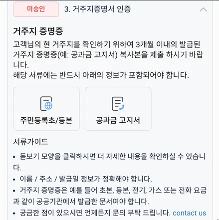 거주지 증명 서류를 제출하시면 담당 부서에서 유효 여부 및 정보 확인 후 승인을 진행합니다.