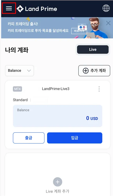 좌측 상단의 메뉴 버튼을 선택해주시기 바랍니다.