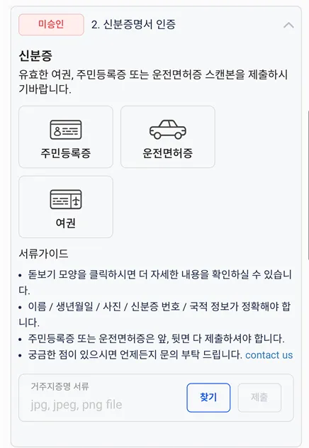 신분증 서류를 ‘찾기’ 버튼을 눌러 선택 후 제출하시면, 담당 부서에서 유효 여부 및 정보 확인 후 승인을 진행합니다.