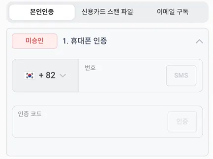 본인 명의의 휴대폰 번호를 입력 후 SMS 버튼을 눌러 문자 메시지로 발송된 인증 코드를 기입하여 인증을 완료하세요.